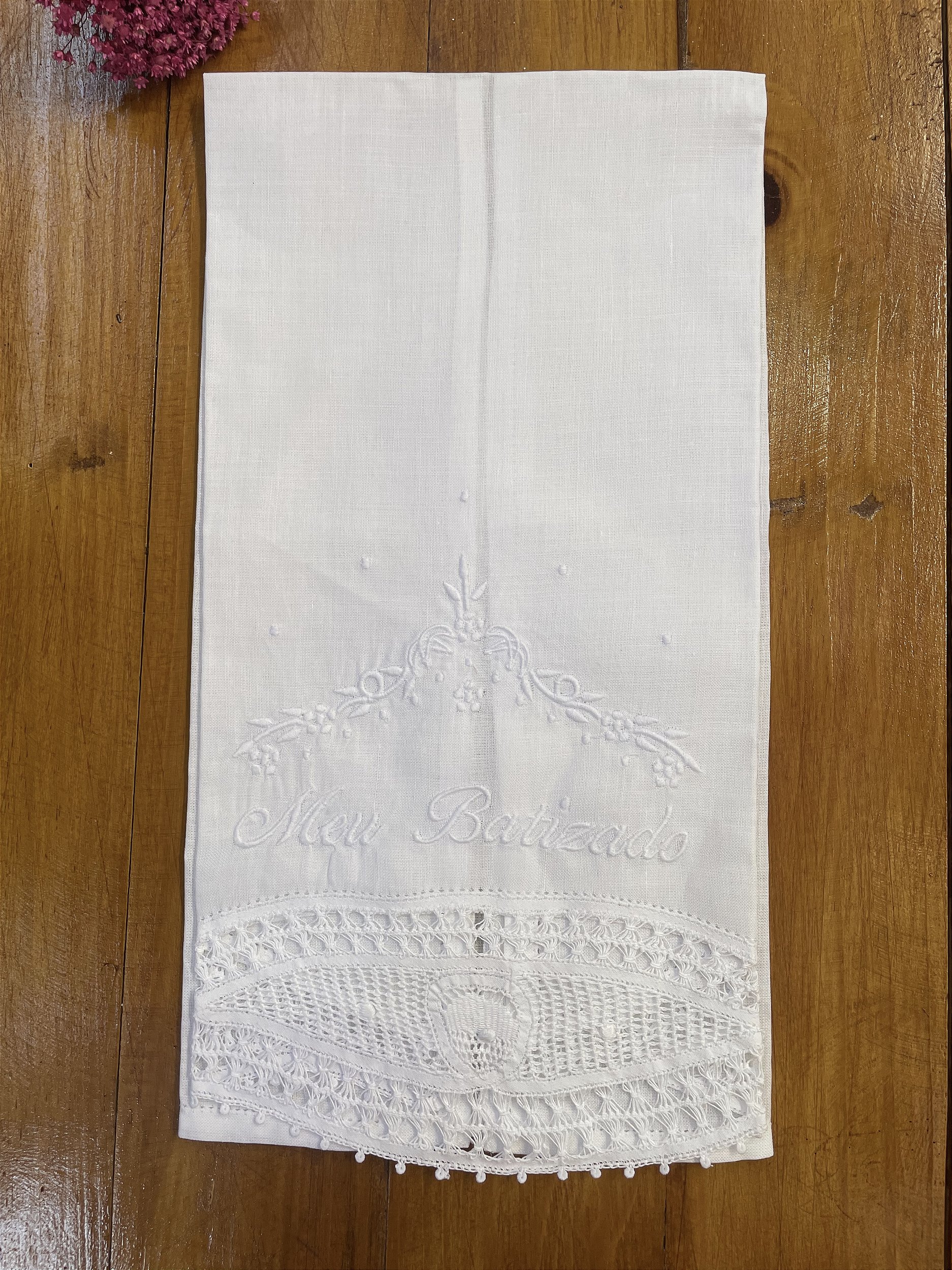 Toalha de batizado em tecido cambraia de linho 100% algodão. Bordado Meu Batizado. Barra em renda Renascença. 67 Cm Comprimento X 35 cm largura