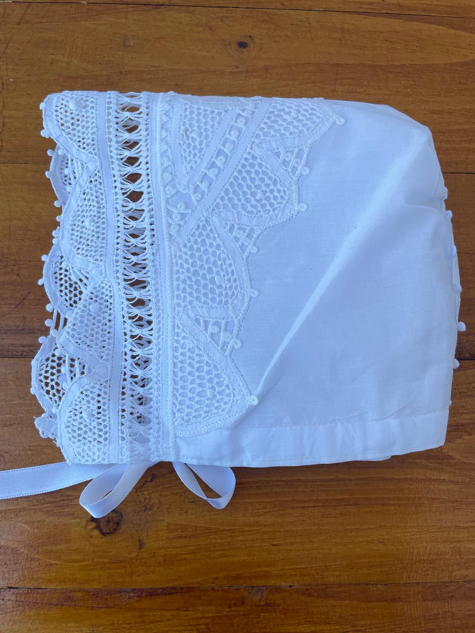Touca para batizado em tecido cambraia de algodão e aplicação em renda renascença.